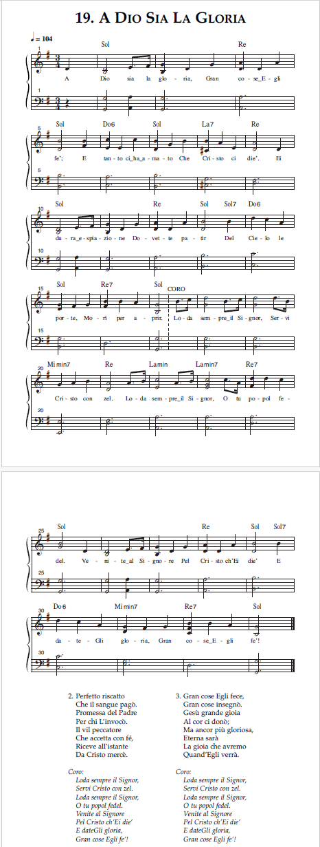 1. A Dio sia la gloria per quanto operò:Amando il mondo il Suo Figlio donò;